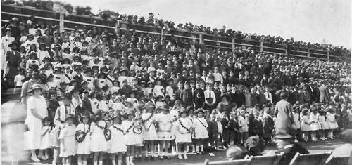 Children of varying ages on Hartlepool Promenade. Boys Brigade/Scouts in centre front. Many of the children are wearing sashes or garlands. A large audience of adults watches from above & there are people on deckchairs at the forefront of the view.