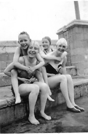 More detail »Jeannie Lappin (wearing some classy pool shoes), Mary Scurr, Billy and Olive at the Hartlepool Headland Outdoor Swimming Pool, in 1931.