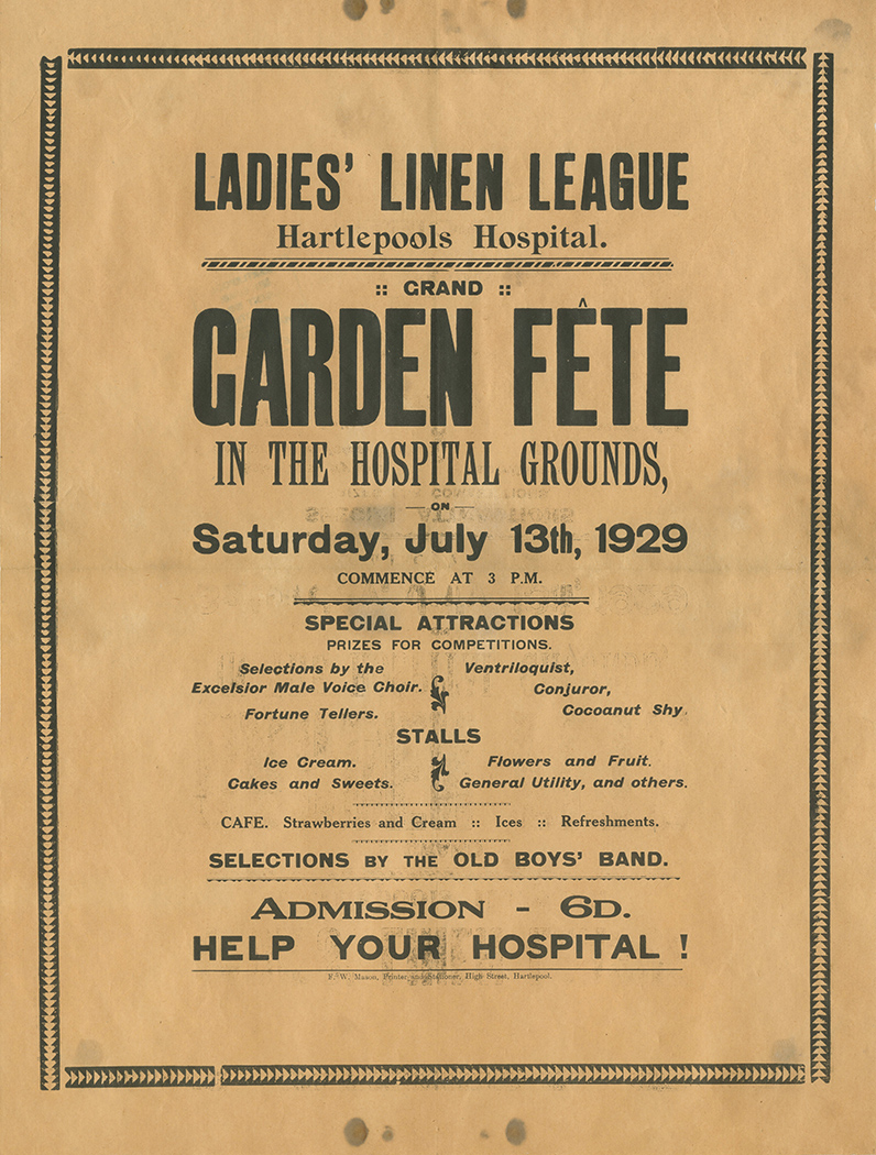 Ladies Linen League. Grand Garden Fete in the Hospital Grounds. To take place on 13th July 1929.